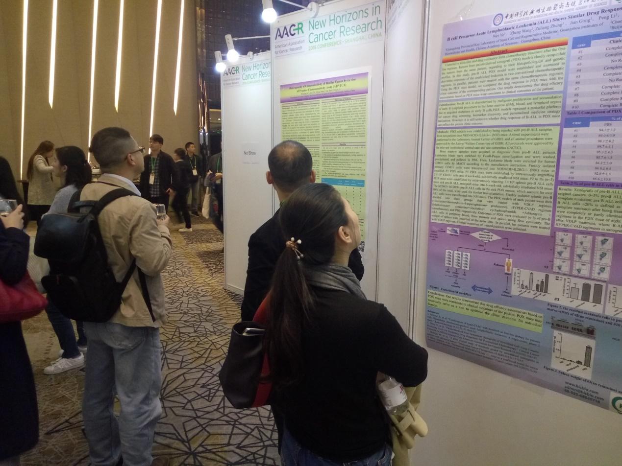 海创生物工作人员正在为专家老师介绍poster“B cell Precursor Acute Lymphoblastic Leukemia (ALL) Shows Similar Drug Response in PDX Mice and the Corresponding Patient”的内容
