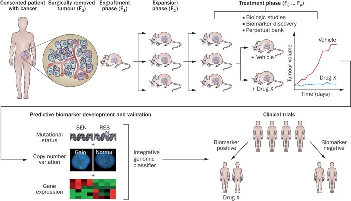 患者来源的肿瘤组织移植到免疫缺陷小鼠的模型(patient derived xenograft,PDX)是指将患者的新鲜肿瘤组织处理后移植到免疫缺陷鼠上,依靠小鼠提供的微环境进行生长,这种模型保留了原代肿瘤的微环境和细胞的基本特性,形成第一代移植瘤。待其生长到一定大小时取该移植瘤组织无菌操作再移植到新一批鼠体内,形成第二代移植瘤。如此重复操作形成移植瘤第三代、第四代等。此种模型尽可能保留了亲代肿瘤生长的微环境,例如肿瘤细胞周围浸润的淋巴细胞、细胞外基质、微血管等,利于更好的表现亲代肿瘤性状,为研究肿瘤提供了很好的体内模型。