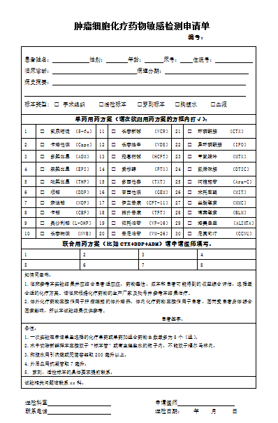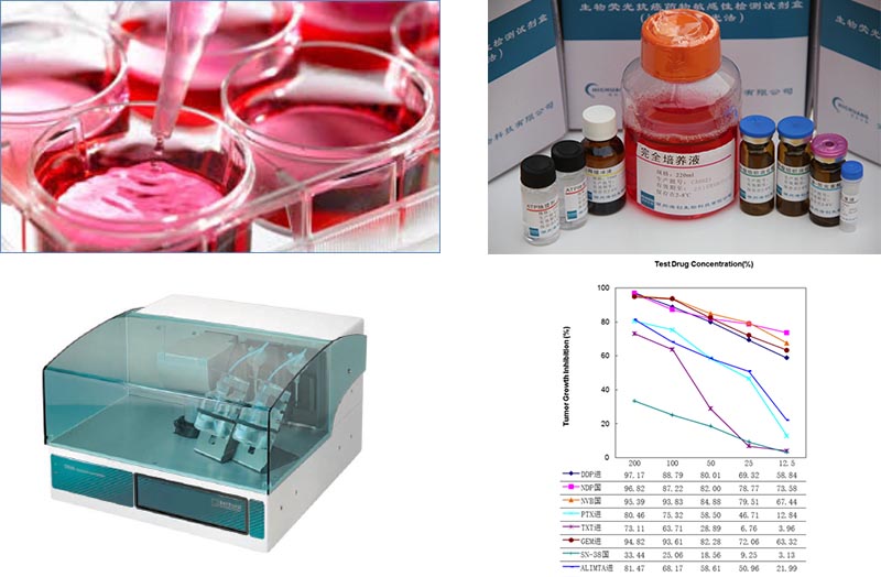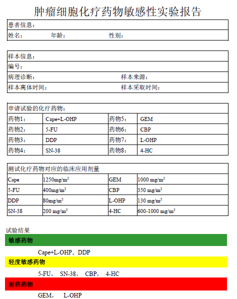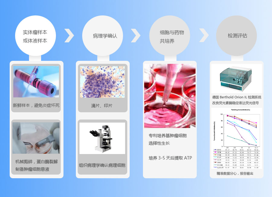 实验原理:在药物开发过程中,化合物的生物活性评价常用体外细胞培养技术;基于此,通过体外共培养来自肿瘤患者的原代肿瘤细胞和候选的临床化疗药物,检测共培养后残存的肿瘤细胞ATP 来计算肿瘤细胞的生存率,得出各筛选药物浓度梯度--肿瘤细胞生长抑制曲线,据此计算评估出在体外此患者肿瘤细胞对各候选药物的敏感和耐药性,重点筛选出耐药药物,以避免无效治疗。